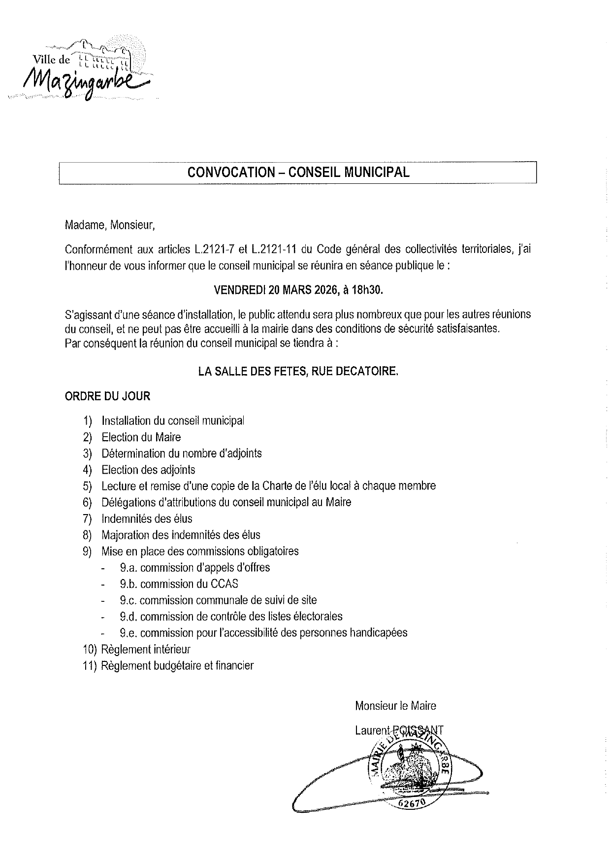Le Conseil Municipal d'installation de Mazingarbe, premier depuis la proclamation des résultats de l'élection municipale sur notre territoire, aura lieu le vendredi 20 mars à 18h30, salle des fêtes, rue Décatoire. Vous êtes invités à assister à cette séance installant le prochain conseil pour le mandat 2026-2032 et élisant le maire de Mazingarbe.
